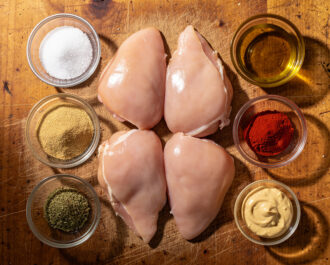 Pat 4 medium boneless, skinless chicken breasts (6-8 oz each) completely dry with paper towels. In a small bowl, mix together 1.5 tsp kosher salt, 1 tsp black pepper, 1 tsp garlic powder, 1 tsp paprika, and ½ tsp dried oregano. Sprinkle this seasoning mix evenly over all sides of the chicken. Place the chicken on a plate or small baking sheet and refrigerate, uncovered, for at least 30 minutes and up to 24 hours.
