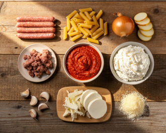 Gather all ingredients: 1 lb ziti pasta, 1 lb Italian sausage (casings removed), 1 medium chopped yellow onion, 4 minced garlic cloves, 1 28-oz can crushed tomatoes, 2 tbsp tomato paste, 1 tsp each dried oregano and basil, ¼ tsp red pepper flakes, 2 tbsp unsalted butter, 2 tbsp all-purpose flour, 1 cup whole milk, 15 oz ricotta cheese, 1 large egg, 1.5 cups grated Parmesan (divided), ½ cup chopped fresh parsley (divided), 8 oz shredded mozzarella, and salt and pepper to taste. Preheat your oven to 375°F (190°C).