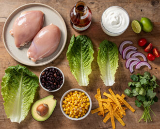 Gather all ingredients: 1.5 lb chicken breasts, 1 tbsp olive oil, 2/3 cup BBQ sauce, 1/3 cup buttermilk, 1/4 cup sour cream, 2 tbsp lime juice, 1/2 tsp each garlic powder and kosher salt, 1/4 tsp black pepper, 2 large chopped romaine hearts, 1 can (15 oz) rinsed black beans, 1 cup corn kernels, 1 cup halved cherry tomatoes, 1/2 cup sliced red onion, 1 diced avocado, 1/4 cup chopped cilantro, and 1/2 cup tortilla strips.