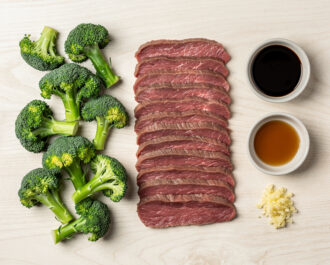 Bring a pot of salted water to a boil. Add the broccoli florets and cook for 90 seconds, just until bright green and crisp-tender. Drain and rinse under cold water to stop the cooking. Heat 1 tbsp vegetable oil in a large skillet or wok over high heat until shimmering. Add the beef in a single layer, working in batches if needed. Sear for 60-90 seconds per side until browned but not cooked through. Remove to a plate.
