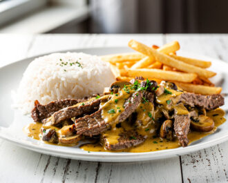 What makes this version special is its unique flavor profile and texture. The sauce is a rich, velvety emulsion of cream, tomato paste, and the fond from seared beef—it’s neither too sharp nor too heavy. The key is balancing the sweet-tangy tomato element with the deep savoriness of the meat. The result is a luxurious, spoon-coating sauce that clings to every piece of tender beef and sautéed mushroom.