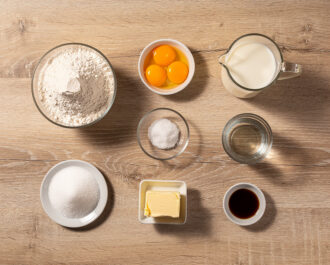 In a large bowl, whisk together the flour, salt, and sugar. In another bowl, beat the eggs, then add milk, water, melted butter, and vanilla. Gradually pour the wet ingredients into the dry, whisking until smooth and lump-free.