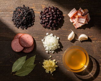 Pick through 1 lb dried black beans for any stones or debris. Rinse well. Soak the beans using your preferred method (overnight in cold water or a quick soak). Slice 12 oz smoked pork sausage into half-moons. Chop 6 oz slab bacon into lardons. Finely chop 1 large yellow onion. Mince 6 garlic cloves. Measure out 6 cups broth, 2 cups water, 2 bay leaves, 1 tbsp kosher salt, 1 tsp black pepper, and 2 tbsp olive oil. Set 2 cups dry white rice aside for cooking separately.