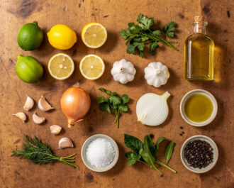 Gather all your ingredients: 6 garlic cloves (finely minced or pressed), ½ cup fresh lime juice, ¼ cup fresh lemon juice, ½ cup olive oil, ½ cup finely grated yellow onion, ¼ cup finely chopped fresh parsley, ¼ cup finely chopped fresh cilantro, 1 tbsp dried oregano, 1 tbsp coarse salt, 2 tsp freshly ground black pepper, and 1 tsp red pepper flakes (if using). Having everything measured and ready makes the process seamless.
