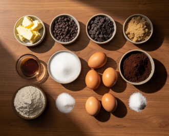 Gather all your ingredients: ½ cup unsalted butter, 8 oz semi-sweet chocolate chips, 2 large eggs, ¾ cup granulated sugar, ¼ cup light brown sugar, 1 tsp vanilla extract, ¾ cup all-purpose flour, ¼ cup unsweetened cocoa powder, ½ tsp baking powder, and ½ tsp salt.