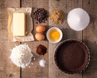 Gather all your ingredients: 1/2 cup unsalted butter, 1 cup semi-sweet chocolate chips, 3/4 cup granulated sugar, 1/4 cup packed light brown sugar, 2 large eggs, 1 teaspoon vanilla extract, 1/2 cup all-purpose flour, 1/4 cup unsweetened cocoa powder, 1/4 teaspoon salt, and 1 (9-inch) pre-made pie crust. Preheat your oven to 350°F (175°C).