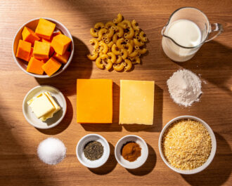 Preheat your oven to 400°F (200°C). Peel, seed, and cube the butternut squash into 1-inch pieces. You should have about 4 cups of cubed squash. Grate the sharp cheddar and gruyere cheeses. Measure out 12 oz of elbow macaroni, 1.5 cups whole milk, 3 tbsp unsalted butter, 2 tbsp all-purpose flour, 1 tsp salt, 1/2 tsp black pepper, 1/4 tsp ground nutmeg, and 1/2 cup panko breadcrumbs.