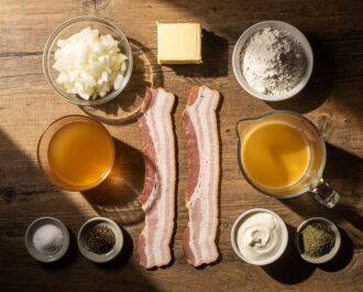 Gather all ingredients: 6 slices bacon, chopped; 1 medium onion, diced; 2 tbsp butter; 3 tbsp all-purpose flour; 4 cups chicken broth; 2 cups milk; 1 cup heavy cream; 1 tsp salt; 1/2 tsp black pepper; 1/2 tsp dried thyme.