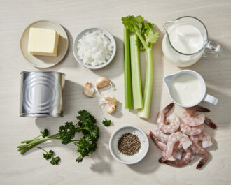 Gather all ingredients: 2 tbsp unsalted butter, 1/2 cup finely chopped yellow onion, 1/4 cup finely chopped celery, 1 minced garlic clove, 1 can (10.5 oz) Campbell's Cream of Shrimp Soup, 1 cup whole milk, 1/2 cup heavy cream, 1/2 cup thawed frozen cooked small shrimp, 1 tbsp chopped fresh parsley, 1/4 tsp black pepper, and an optional 1/8 tsp paprika.