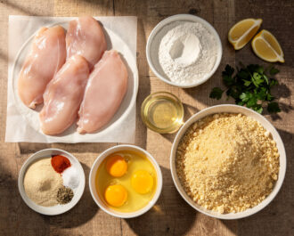 Gather all ingredients: 4 boneless, skinless chicken cutlets, ¾ cup all-purpose flour, 1 tsp each garlic powder and onion powder, ½ tsp sweet paprika, 1 tsp kosher salt, ½ tsp black pepper, 3 large eggs, 2 tbsp whole milk, 1 ½ cups panko breadcrumbs, ¾ cup neutral oil, 1 lemon cut into wedges, and 2 tbsp chopped fresh parsley. Set up three shallow dishes: one for the flour mixed with all dry spices, one for the eggs whisked with milk, and one for the panko breadcrumbs.