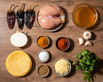 Gather all ingredients: 3 dried ancho chilies, 1.5 lb chicken breasts, 2 cups chicken broth, 1 medium diced yellow onion, 4 minced garlic cloves, 1 tsp ground cumin, 1/2 tsp dried Mexican oregano, 2 tbsp tomato paste, 2 tbsp all-purpose flour, 12 corn tortillas, 3 cups shredded Monterey Jack cheese, 1 tsp salt, 1/2 tsp black pepper, 2 tbsp vegetable oil, and 1/4 cup chopped fresh cilantro.