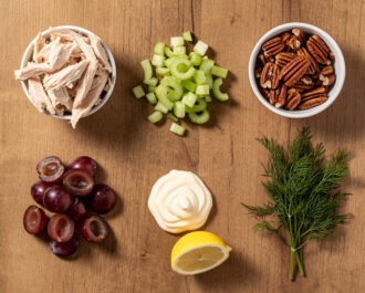 Ensure you have 3 cups of shredded cooked chicken breast, cooled to room temperature. Finely dice 2 stalks of celery, halve 1 cup of red seedless grapes, toast and chop 1/2 cup of pecans, and chop 2 tablespoons of fresh dill. Measure out 3/4 cup mayonnaise, 1 tablespoon fresh lemon juice, 3/4 teaspoon kosher salt, and 1/2 teaspoon freshly ground black pepper.