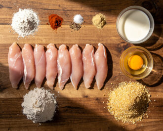 Working with one piece at a time, coat a chicken strip thoroughly in the seasoned flour mixture, shaking off any excess. Next, dip it into the buttermilk-egg mixture, letting the excess drip back into the bowl. Finally, press the strip firmly into the panko breadcrumbs, coating all sides evenly. Transfer the breaded strip to the wire rack. Repeat with all remaining pieces.