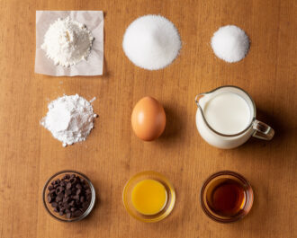 Gather all your ingredients: 1 1/2 cups all-purpose flour, 2 tbsp cornstarch, 2 tbsp granulated sugar, 1 tbsp baking powder, 1/4 tsp baking soda, 1/2 tsp fine sea salt, 1 large egg, 1 1/4 cups buttermilk, 1/4 cup whole milk, 1 tsp pure vanilla extract, 3 tbsp melted and cooled unsalted butter, 3/4 cup semi-sweet chocolate chips, and 1 tbsp of butter or oil for the griddle. This ensures a smooth cooking process.