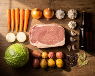 Rinse the corned beef brisket under cold water. Peel and quarter the onions, smash the garlic cloves, peel and chunk the carrots, and cut the potatoes and cabbage. Measure out the beer, water, peppercorns, and bay leaves. Have the spice packet from the brisket ready.