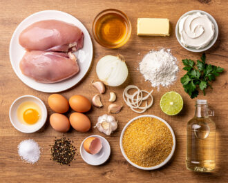 Gather all ingredients: 1 lb chicken breast, 3 cups chicken broth, 2 tbsp unsalted butter, 1 medium finely chopped yellow onion, 3 minced garlic cloves, 2 cups all-purpose flour, 4 oz cream cheese, 1/4 cup chopped fresh parsley, 1 tbsp lime juice, 2 large beaten eggs, 2 cups fine breadcrumbs, 8 cups vegetable oil for frying, 1 1/2 tsp salt, and 1/2 tsp black pepper.