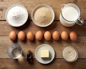 In a large bowl, whisk together the gluten-free flour, almond flour, sugar, and salt. In a separate bowl or large measuring jug, vigorously whisk the eggs, milk, melted butter, and vanilla until completely smooth and homogenous.
