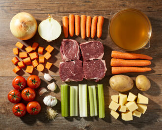 Pat the 2 lbs of beef chuck roast dry with paper towels and cut it into 1-inch cubes. Season generously with 1.5 tsp kosher salt and 1 tsp black pepper. Chop the onion, slice the carrots and celery, mince the garlic, peel and cube the potatoes, and measure out all remaining ingredients.