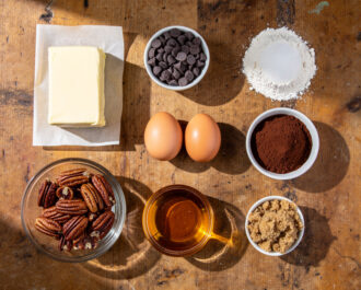 Gather and measure: 1 cup unsalted butter, 8 oz bittersweet chocolate chips, 1.5 cups granulated sugar, 4 large eggs, 2 tsp pure vanilla extract, 1 cup all-purpose flour, 1/3 cup unsweetened cocoa powder, 1/2 tsp salt, 2 cups pecan halves, 3/4 cup dark corn syrup, 1/2 cup packed dark brown sugar, and 2 tbsp bourbon (or 2 tbsp extra vanilla extract).