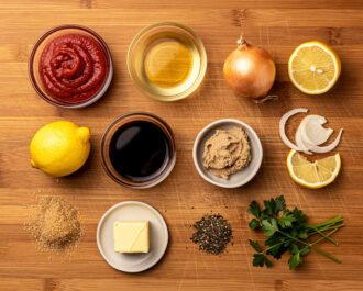Gather all your ingredients: 1 cup tomato puree, 1/2 cup white wine vinegar, 1/4 cup water, 2 tbsp Worcestershire sauce, 1 tsp anchovy paste, 1/4 cup finely grated yellow onion, 1 tbsp fresh lemon juice, 2 tbsp packed light brown sugar, 1/2 tsp ground black pepper, 4 tbsp cold unsalted butter (cut into small cubes), and 1 tbsp finely chopped fresh parsley. Having everything measured and ready makes the process smooth and fast.