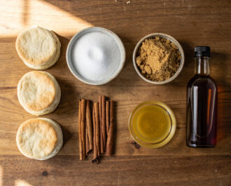 Working in batches, drop the quartered biscuit pieces into the cinnamon-sugar bowl. Toss vigorously until each piece is thoroughly coated. Don't be shy—get every nook and cranny covered. The more sugar that sticks now, the better the caramelized crust later.