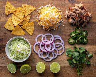 Carefully remove the hot pan from the oven. Evenly scatter the warmed pulled pork over the melted cheese. Top with the remaining chips, then the remaining cheeses. Add the sliced red onion and pickled jalapeños across the top. Return the pan to the oven and bake for another 8-10 minutes, until the new cheese layer is thoroughly melted and the edges of the chips are golden.