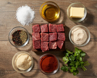 Gather all your ingredients: 1.5 lb sirloin steak cubes, 2 tsp kosher salt, 1 tsp coarse black pepper, 1 tsp granulated garlic, 1 tsp onion powder, 1 tsp smoked paprika, 2 tbsp neutral oil, 2 tbsp unsalted butter, and 2 tbsp chopped fresh parsley. Place the steak cubes on a stack of paper towels and pat them aggressively dry on all sides; this is crucial for a good sear. In a small bowl, combine the salt, pepper, garlic, onion powder, and smoked paprika to create your dry rub.